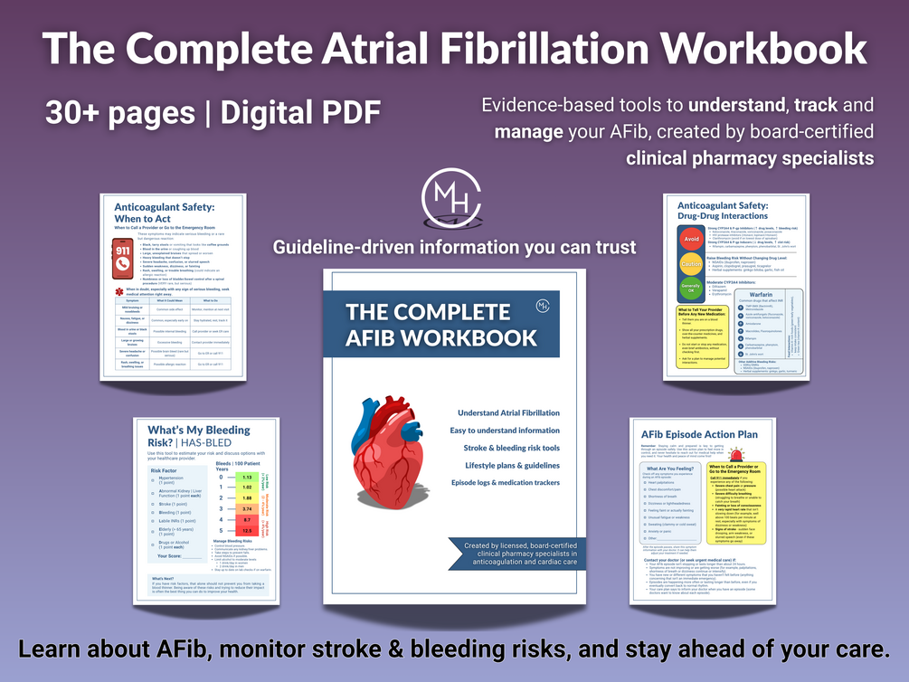 Evidence‑based guidance and practical tools for living well with atrial fibrillation, written by licensed clinical pharmacy specialists.
