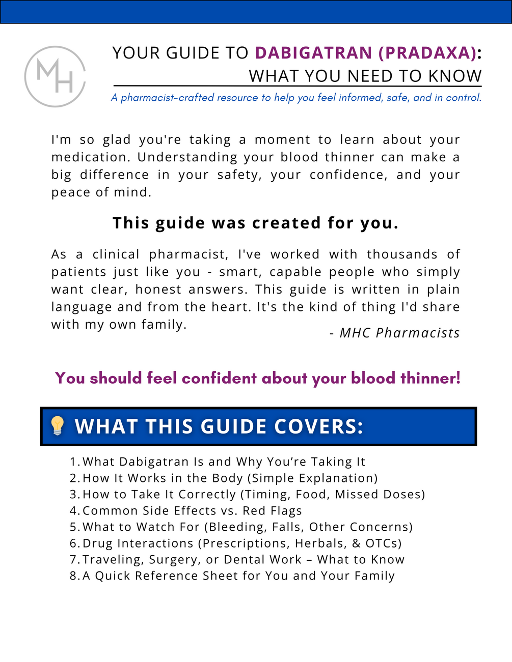 dabigatran, Pradaxa, blood thinner guide, AFib stroke prevention, DVT treatment, PE recovery, anticoagulant education, how to take dabigatran, Pradaxa side effects, missed dose dabigatran, Pradaxa vs warfarin, dabigatran vs eliquis, patient-friendly medication guide, blood thinner safety, pharmacist created resource
